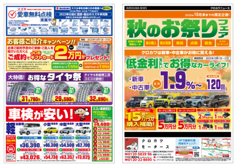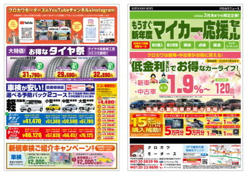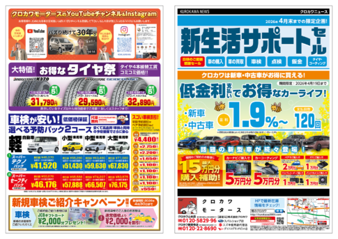 クロカワのYouTubeチャンネル クロカワモータースのYouTubeチャンネル。大好評配信中! チャンネル登録はこちら 話題の新車種も取り扱いしています! TOYOTA 新型アルファード さらにラグジュアリー感が増した新型アルファード! 最新チラシ 期間限定のお得情報! +大きく表示する最新チラシ 在庫車検索はこちら 注目ページ! 月々定額で車に乗れるリースプラン SHOP INFO 店舗情報 三豊山本店(本店) 〒768-0103 香川県三豊市山本町財田西310 地図をみる 新車を月々1万円〜フラット7 車検のコバック 観音寺店 〒768-0021 香川県観音寺市吉岡町123 地図をみる 新車を月々1万円〜7Max 軽未使用車専門店 コバックサテライト店 東京タイヤ流通センター 店舗案内を詳しくみる クチコミ募集中! KUROKAWA クロカワではお客様のクチコミを募集しています!よろしければGoogleレビューをお願いいたします。 クチコミを書く (Googleレビュー) クロカワができる「8つのこと」 自動車のことなら何でも行える「ワンストップサービス」を実現! 車輌販売 新車・中古車・未使用車 車検 安心車検・保証整備 保険 新規加入・事故対応 ロードサービス 緊急修理・レッカー・レンタカー 板金 一般修理・事故修理 買取・廃車 買取・下取り・廃車 整備・オプション 整備・パーツ・タイヤ・洗車 購入サポート クレジット120回払い対応 ご予約はこちらから 車検、点検、オイル交換はWEBからのご予約が便利です! WEB予約ページへ