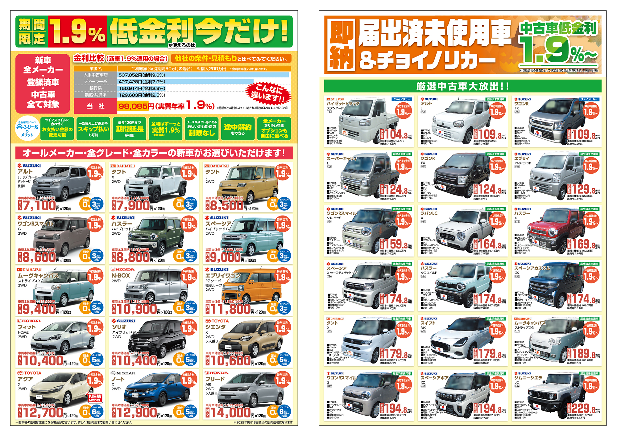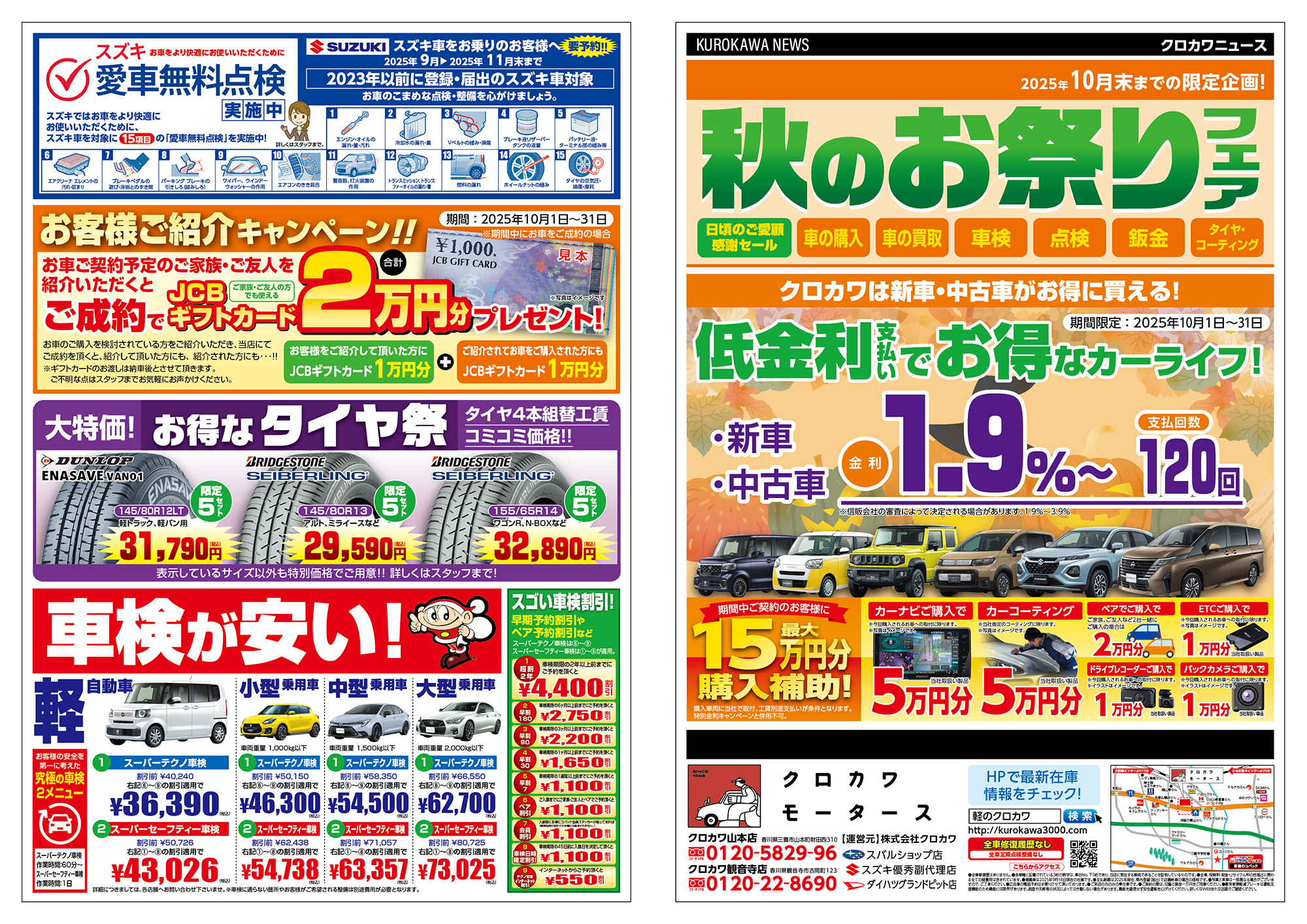 最新チラシ WEB FLYER キャンペーン期間が過ぎているチラシは無効となりますので、チラシの有効期限をよくご確認ください。 有効期限 2025年10月末まで! ご予約はこちらから 車検、点検、オイル交換はWEBからのご予約が便利です! WEB予約ページへ