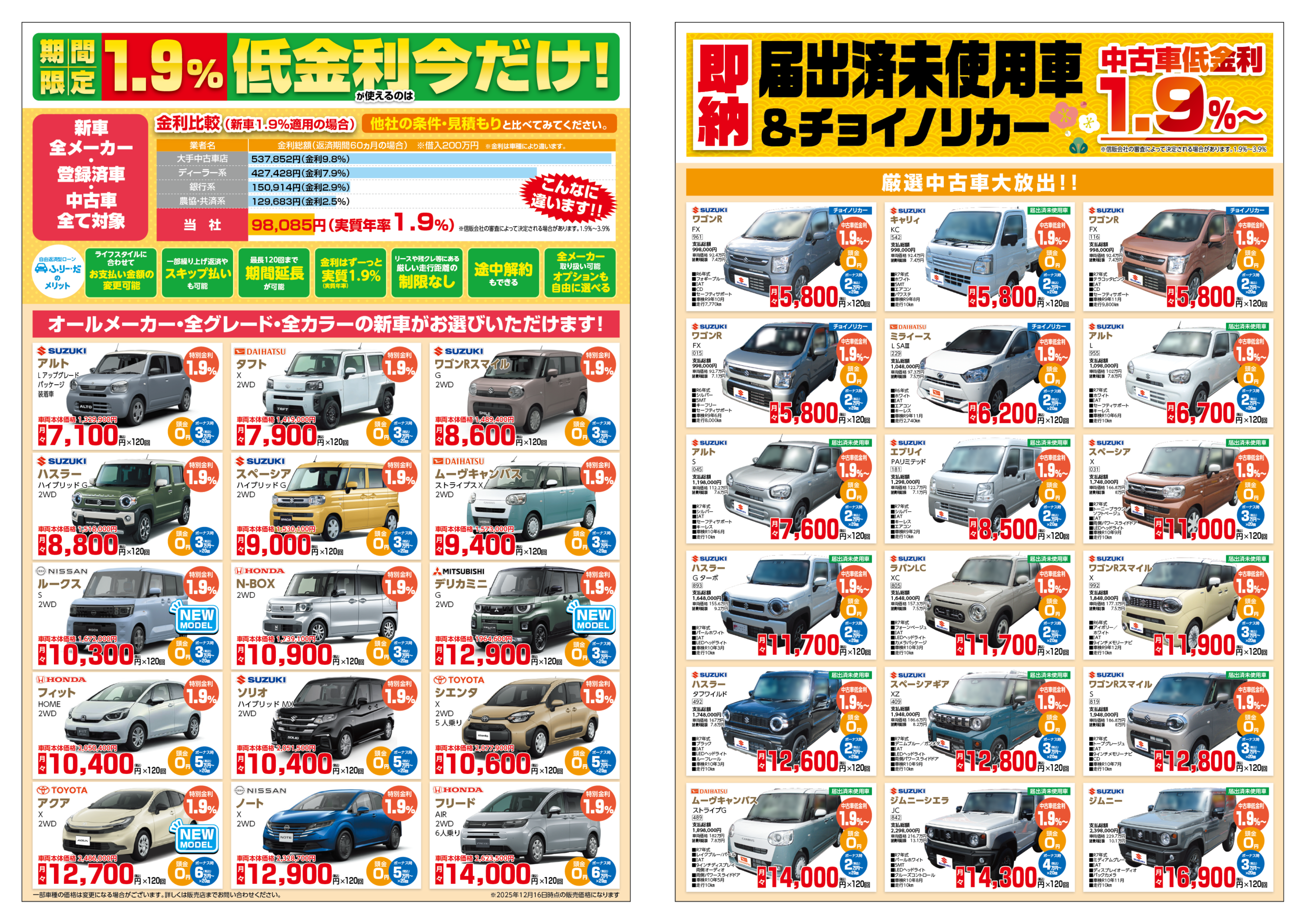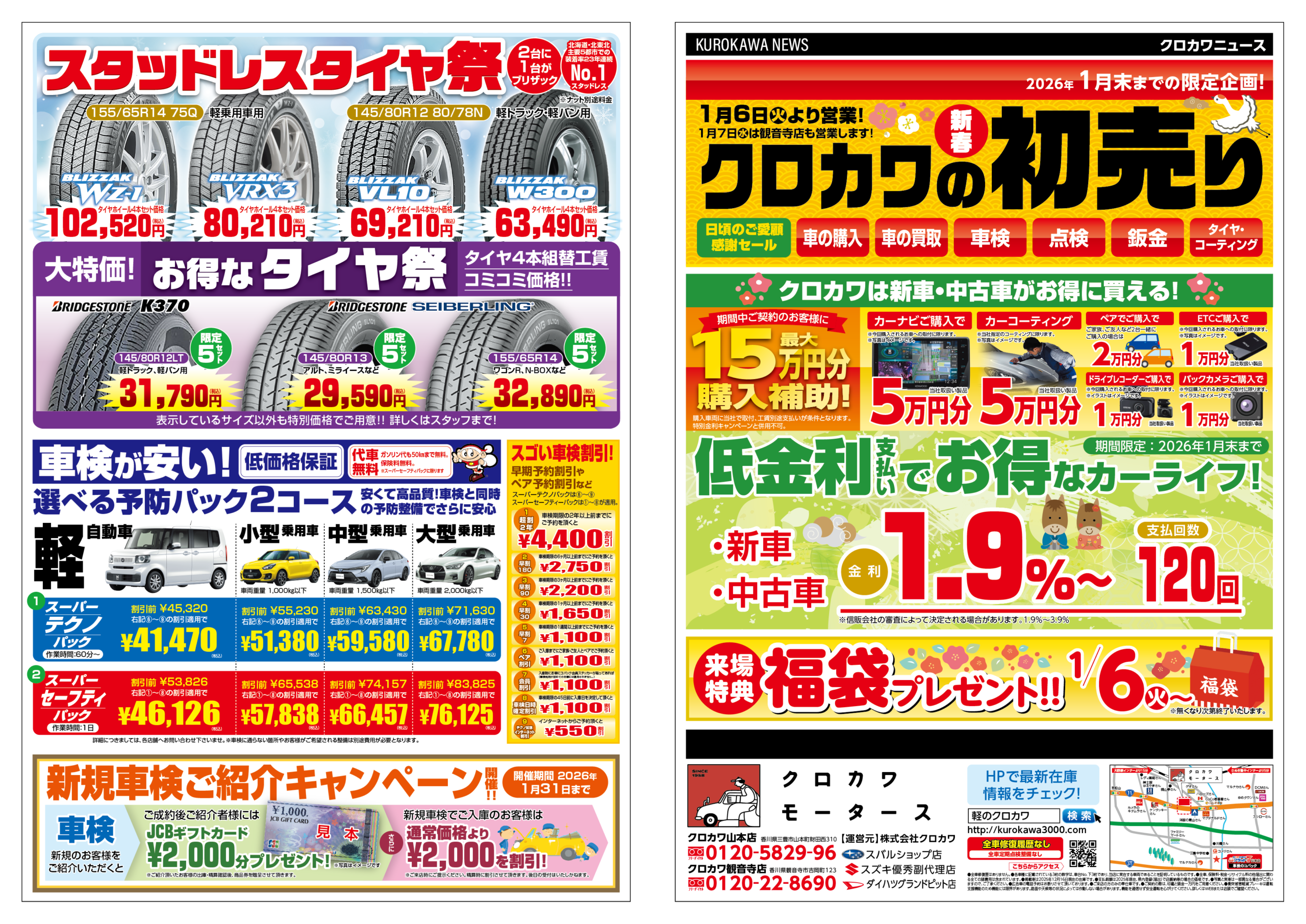 最新チラシ WEB FLYER キャンペーン期間が過ぎているチラシは無効となりますので、チラシの有効期限をよくご確認ください。 有効期限 2026年1月末まで ご予約はこちらから 車検、点検、オイル交換はWEBからのご予約が便利です! WEB予約ページへ